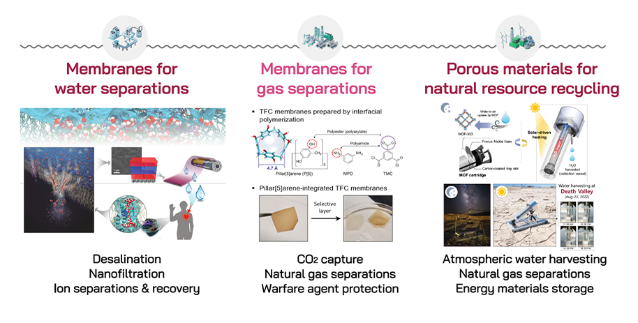Energy and Environmental Membrane Research Lab develops advanced membrane materials based on nanoporous materials and polymers. Our research focuses on next-generation membrane technologies applicable to key separation processes in energy and environmental systems, including gas separation, water treatment, and ion separation.