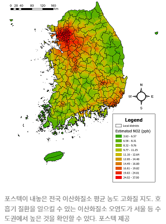 이산화질소는 자동차 배기가스와 발전소에서 주로 배출되는 대기오염물질이다. 호흡기 질환을 유발할 수 있어 법적으로 엄격히 규제되고 있다. 다른 대기오염물질보다 반응성이 크고, 대기 중 체류 시간이 짧아 지역별로 농도 차이가 크다. 하지만 지상 측정소의 수가 제한적이고 고르게 분포되어 있지 않아 그동안은 수 km 단위 넓은 지역의 평균값만 추정해 왔다.