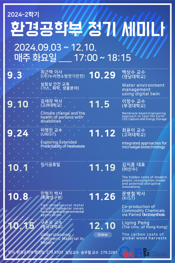 2024-2학기 환경공학부 정기 세미나 작성일 25-11-24 00:44 페이지 정보 일시 매주 화요일 17시 ~ 18시 15분 발표자 문의 279-8303 / dese@postech.ac.kr 본문 목록 이전글2025-1학기 환경공학부 정기 세미나 25.11.24 다음글2024-1학기 환경공학부 정기 세미나 25.11.24 댓글 0 댓글목록 등록된 댓글이 없습니다.