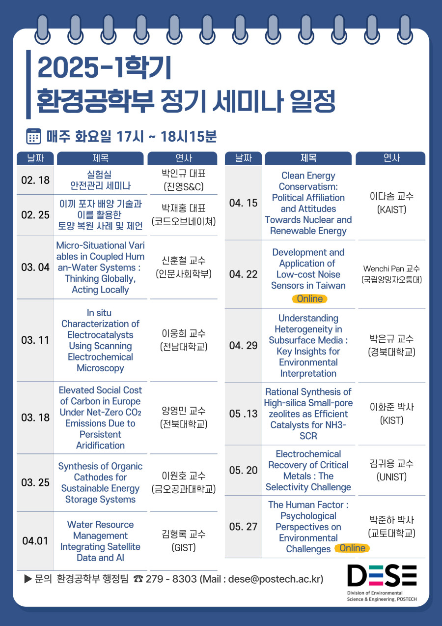 2025-1학기 환경공학부 정기 세미나 작성일 25-11-24 00:45 페이지 정보 일시 매주 화요일 17시 ~ 18시 15분 발표자 문의 279-8303 / dese@postech.ac.kr 본문 목록 이전글2025-2학기 환경공학부 정기 세미나 25.11.28 다음글2024-2학기 환경공학부 정기 세미나 25.11.24 댓글 0 댓글목록 등록된 댓글이 없습니다.