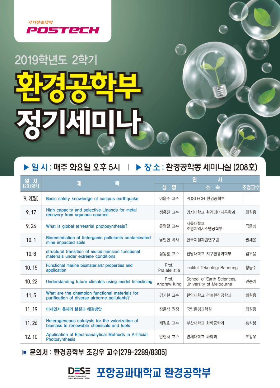 2019-2학기 환경공학부 정기 세미나 작성일 25-11-24 00:28 페이지 정보 일시 매주 화요일 17시 ~ 18시 15분 발표자 문의 279-8303 / dese@postech.ac.kr 본문 목록 이전글2020-1학기 환경공학부 정기 세미나 25.11.24 다음글2019-1학기 환경공학부 정기 세미나 25.11.24 댓글 0 댓글목록 등록된 댓글이 없습니다.