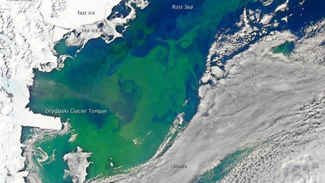 바다에 사는 미세조류는 대표적 온실가스인 이산화탄소를 흡수하여 지구온난화를 완화하는 역할을 하는데, 극지방의 얼음에서 미세조류의 성장을 돕는 철 이온이 방출되는 현상을 발견한 것입니다.