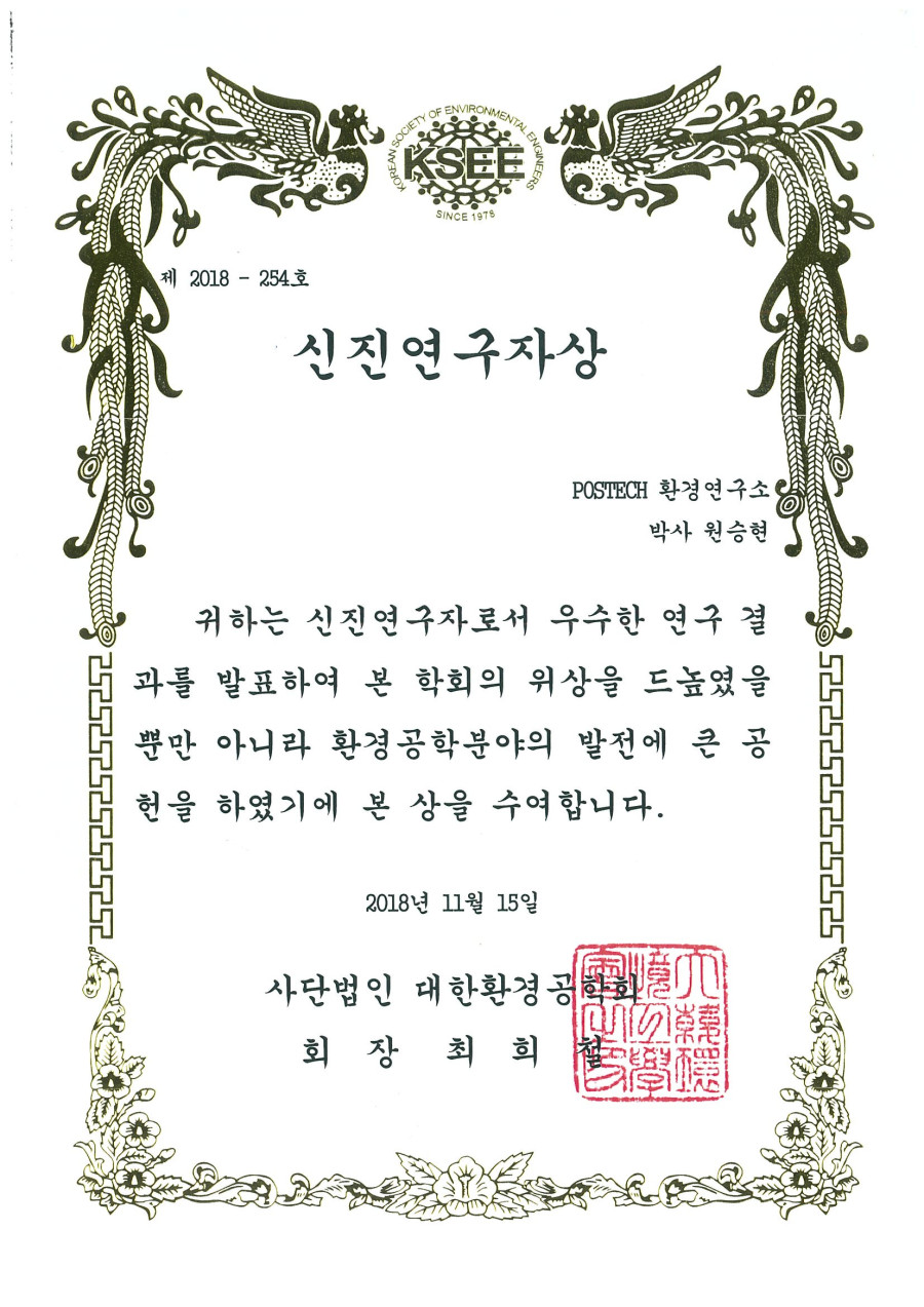 환경공학부 원승현 박사(지도교수 최원용)님께서 지난 11월 15일(목) 김대중컨벤션홀에서 개최된 2018년 대한환경공학회 창립 40주년 기념 및 국내학술대회에서 대한환경공학회 신진연구자상을 수상하셨습니다.