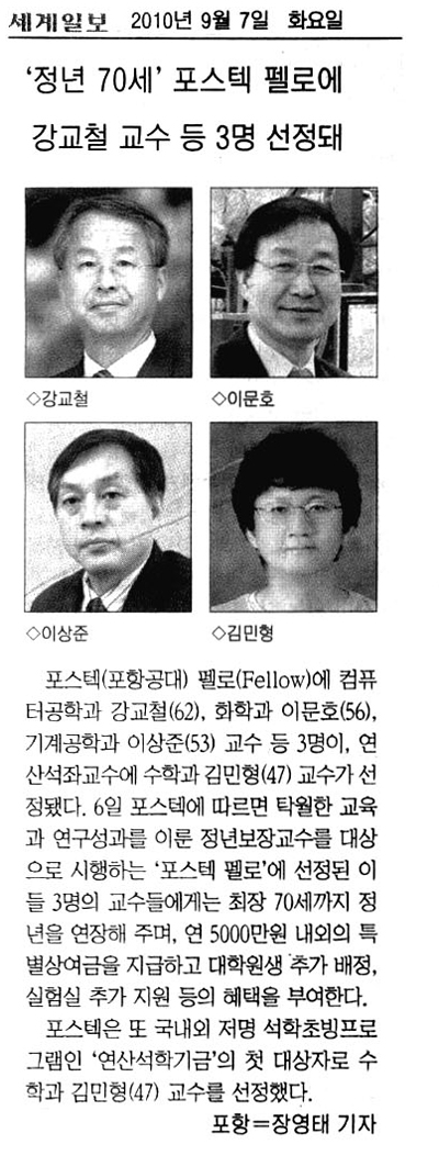 한편, POSTECH은 고(故) 이원국 대원(주) 사장이 교육•연구의 발전을 위해 기탁한 발전기금을 바탕으로 마련한 국내외 저명 석학초빙프로그램인 ‘연산(延山)석학기금’의 첫 대상자로 수학과 김민형(47) 교수를 선정했다.