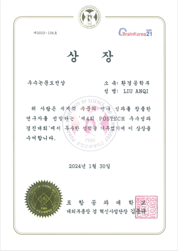환경공학부 LIU ANQI(지도교수 이형주)는 지난 1월 30일(화) 개최된 제4회 POSTECH 우수성과 경진대회에서 우수논문도전상을 수상하였습니다.
